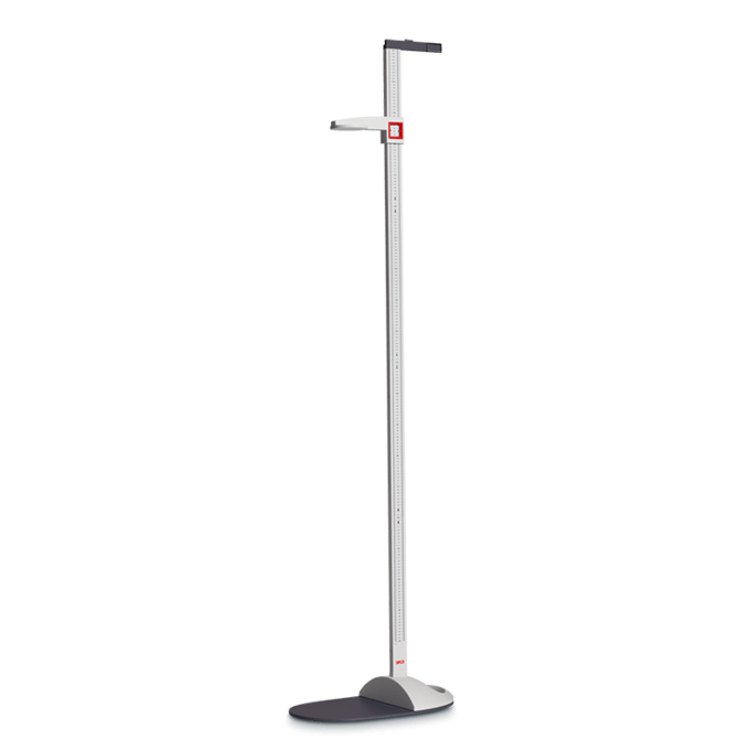 El tope para la cabeza, grande y estable, asegura una alta precisión de la medición. De material plástico que no se distorsiona ni deforma, se desliza hasta la cabeza con extraordinaria suavidad. Otro detalle muy bien pensado: la escala de fácil lectura situada en el lateral del tallímetro ya permite consultar la talla mientras se está efectuando la medición; de esta manera, asegura resultados precisos hasta una talla de 205 cm.